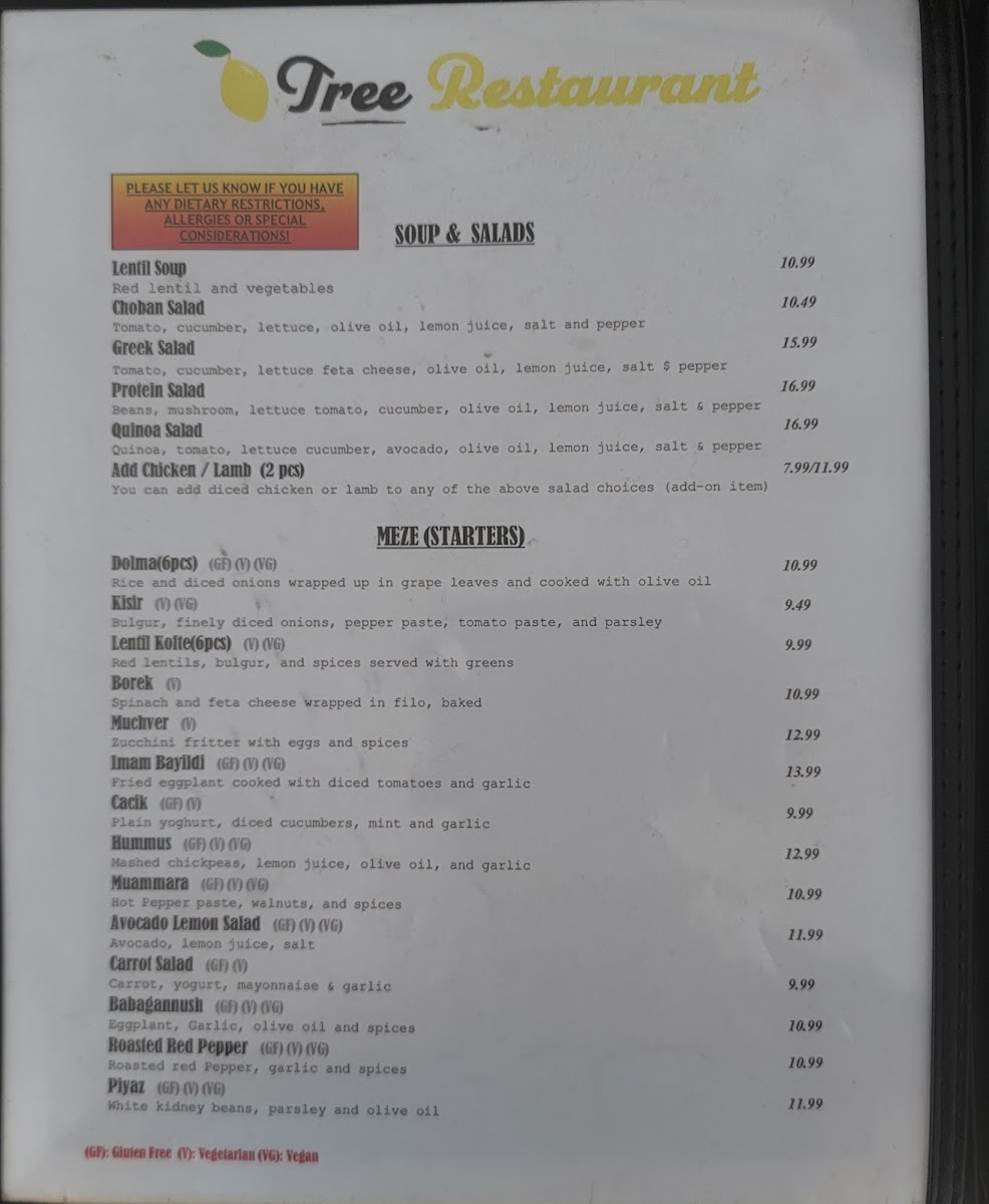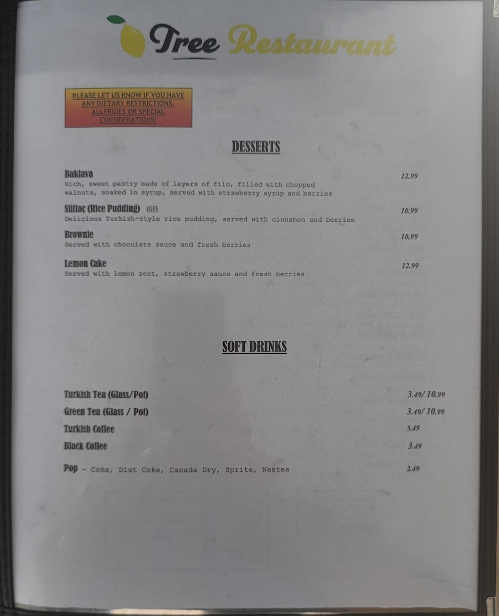 Welcome to Lemon Tree Restaurant, a delightful culinary destination located at 805 Bedford Hwy, Bedford, NS. This must-visit eatery offers a wide-ranging menu that highlights authentic Turkish flavors, perfect for both vegans and carnivores alike. Start your meal with mouthwatering Dolma Rice, tender stuffed grape leaves infused with olive oil, or the zesty Kisir Bulgur salad. For heartier options, indulge in their famous Fatih Kebab or deliciously spiced Lamb Tandir.